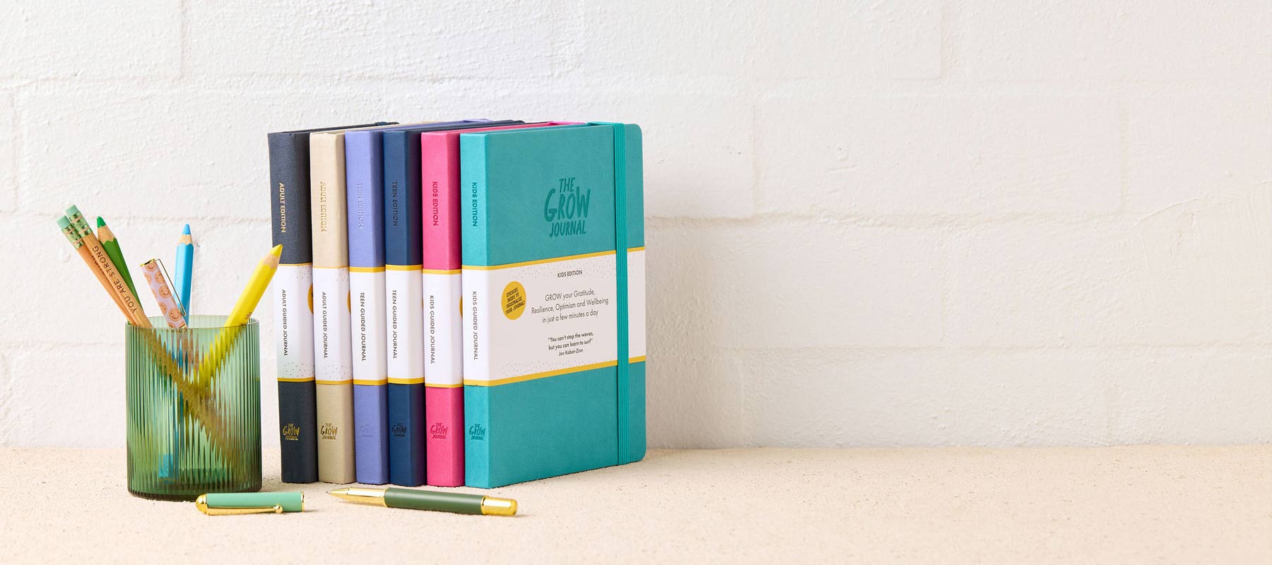 GROW is an acronym for gratitude, resilience, optimism and wellbeing - four powerful pillars that underpin the Journals, and the foundations that you create when you use a Grow Journal.